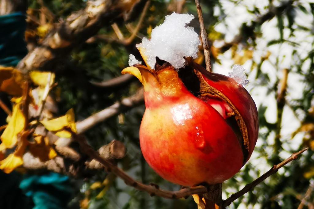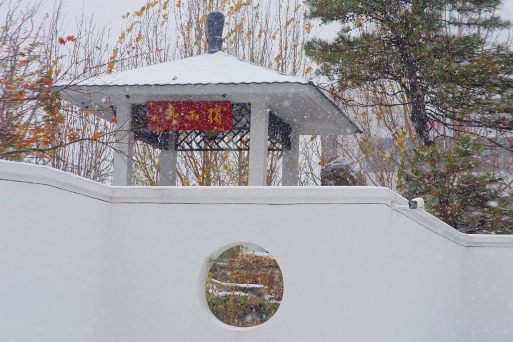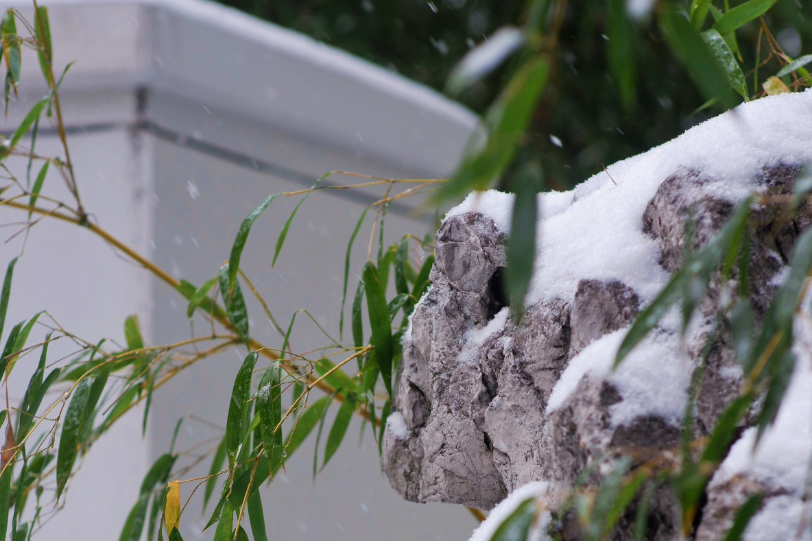 窗外飘洒素雪,纯净清冷。室内围炉而坐,茶香四溢。凭栏观树,赏雪拥竹,近看风雨。雪花点点,将这片天地渲染的洁白灵动。纤尘不染,雪落无息,听其诉说着真意,从容而静谧。待到天晴,枝头柿子与顶雪石榴相映成趣,听落雪轻敲竹声,看闲庭粉妆玉琢。