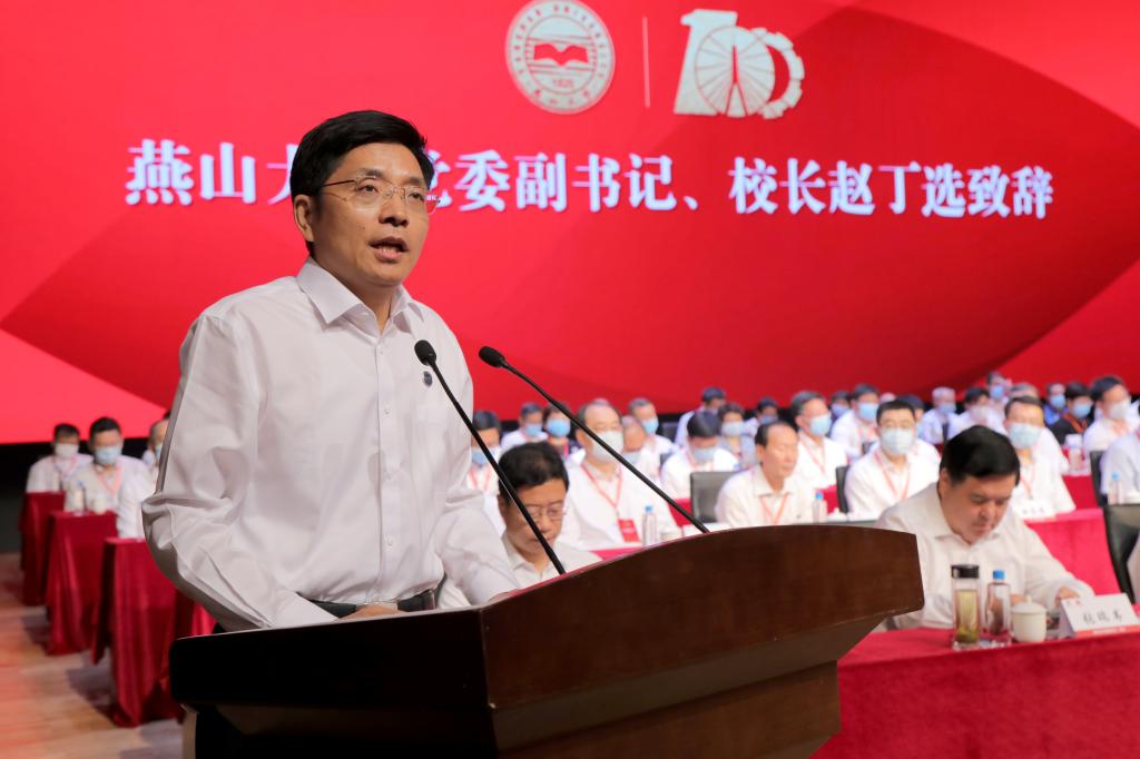 赵丁选说,在去年召开的第四次党代会上,学校审时度势、集思广益,确定了“全面建成特色鲜明、国内一流、世界知名研究型大学”的奋斗目标,这是燕山大学在历史交汇点上的伟大宣示,是新时代燕大人做出的使命选择。当我们站在民族伟大复兴的舞台上,面临国内循环为主体,国内国际双循环相互促进的新发展格局,更要以长远的眼光,思考中国进入新发展阶段,燕山大学如何赢得优势,赢得主动,赢得未来,汇聚起重整新装再出发的磅礴力量,在新时代开启百年新征程。新百年新燕大。我们不忘初心、牢记使命,始终把立德树人作为学校立身之本,建设矢志一流、英才辈出的燕山大学;我们瞄准前沿、科学布局,始终以“三个面向”作为学校主攻方向,建设善于创新、务实担当的燕山大学;我们坚韧不拔、不懈奋斗,始终把家国天下作为学校力量源泉,建设气质卓越、风骨雄健的燕山大学。他说,时代的潮流浩荡前行,奋斗的激情永远燃烧。今天,历史的接力棒传到了我们手里。在新百年征途中,我们将以习近平新时代中国特色社会主义思想为指导,承继燕山大学一个世纪的光荣与梦想,扎根中国大地办大学,为党育人,为国育才,争做时代新人的培育者、国之重器的创造者、新风正气的引领者和燕大精神的传承者,全面推进特色鲜明、国内一流、世界知名研究型大学建设,为实现高等教育内涵式发展,办出中国特色一流大学,努力创造无愧于时代的光辉业绩,共同谱写壮丽的新时代华章!
