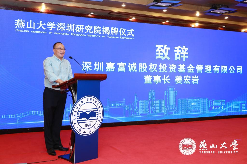 深圳嘉富诚股权投资基金管理有限公司董事长姜宏岩作为研究院合作企业代表致辞。他表示,愿携手研究院加快组建创新团队、搭建研发平台、设立产业基金,推动各项业务工作迅速开展,共同将研究院打造成创新人才富集、创新成果显著、创新环境优越的创新创业高地。
