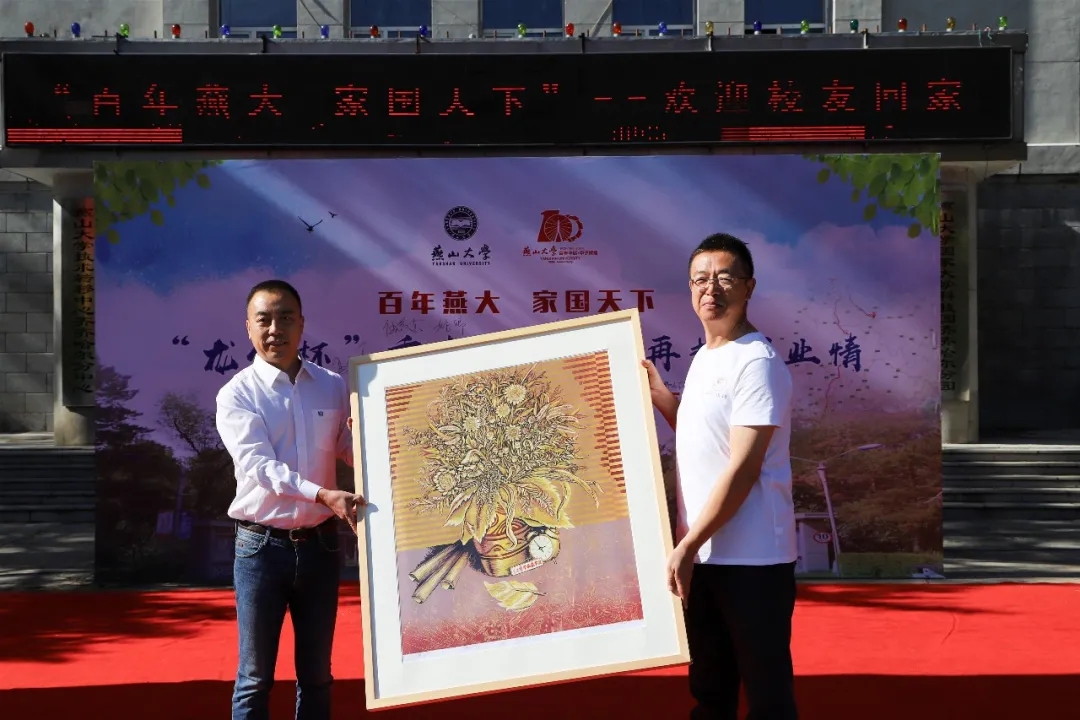 88级工企专业校友冯继勇向母校捐赠庆祝燕山大学“建校溯源百周年 独立办学一甲子”系列版画。他说当来到独立办学发祥地,看到这座雄伟的大灰楼,心中涌动着神圣之感,它虽然简陋,但却奠定了燕大人艰苦奋斗的基因,铸就着家国天下的精神品格,是我们艰苦奋斗的见证。都说传承才是最好的纪念,如今艰苦奋斗的精神在燕山大学得到了永续传承。2020年是我们燕山大学建校溯源百周年,独立办学一甲子的重要年份。在市委市政府和区委、区政府的支持下,我们邀请到业内闻名的齐齐哈尔版画院张书君院长,他亲自带领八位版画师花了将近一年的时间创造了这幅版画。他深情地说,齐齐哈尔藏龙卧虎,富拉尔基人杰地灵,他为自己诞生在富拉尔基而感到自豪。今天他把版画送给燕山大学,希望燕山大学在祖国最好的时代腾飞,再塑辉煌。