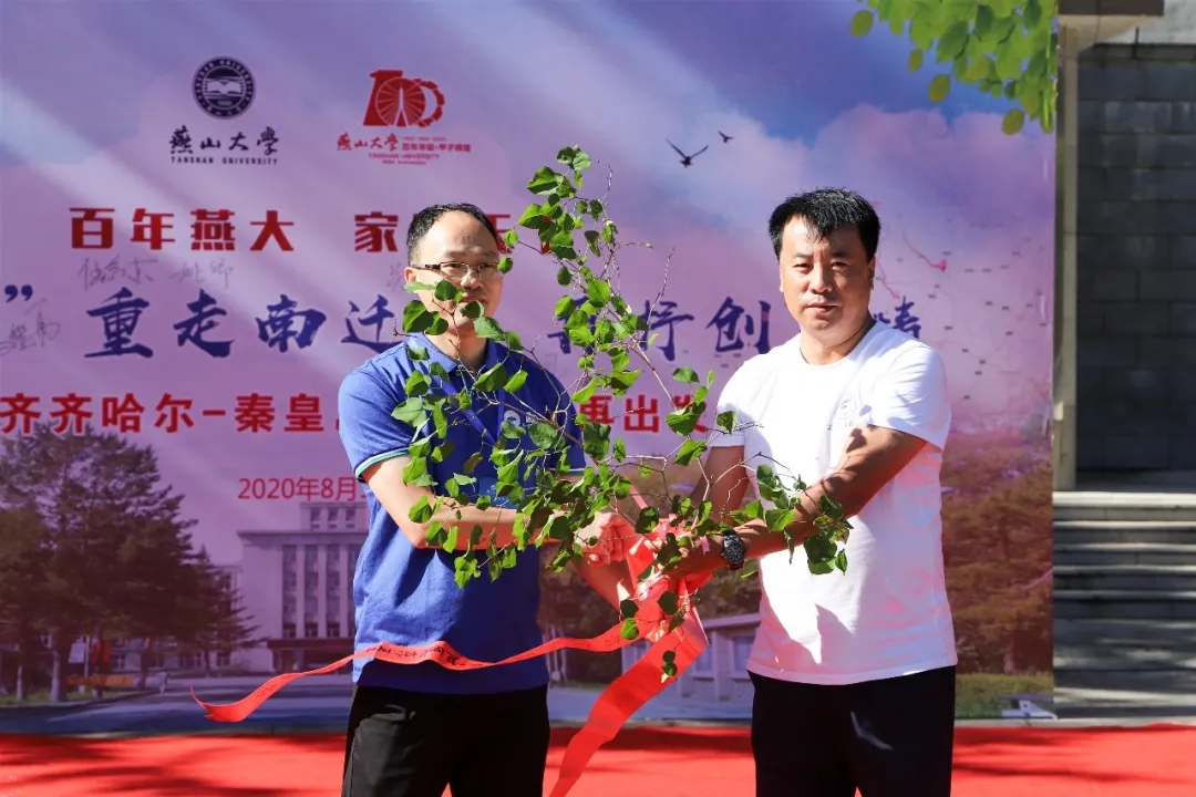 齐齐哈尔校友会将收集好的生命之水——嫩江水交接给骑行代表;并将东重校园内的一颗丁香树转赠燕山大学,这颗丁香树将移栽在燕山大学校园里,传承东重的历史韵味。