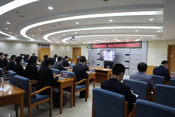 【新闻中心讯】为弘扬“五四”精神,深入学习习近平总书记关于疫情防控工作重要讲话和指示批示,4月29日上午,“五四”青年节即将来临之际,我校在世纪楼18楼报告厅召开以“让青春为祖国绽放”为主题的五四青年节座谈会,校党委书记赵险峰、校长赵丁选与学生代表“齐聚一堂”,共同纪念五四运动101周年,并发表重要讲话。活动由校党委副书记黄晟主持,相关职能部门负责人以及各级团干部参加现场座谈会,8位青年学子代表通过线上视频直播的方式进行了发言。