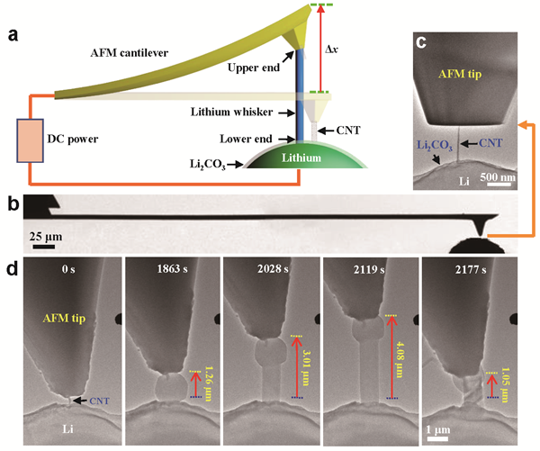 【新闻中心讯】近日,我校亚稳材料制备技术与科学国家重点实验室黄建宇教授、沈同德教授与国内外科学家合作,在Nature Nanotechnology上发表题为“Lithium whiskers growth and stress generation in an in situ atomic force microscope-environmental transmission electron microscope setup”的研究论文(论文链接:https://www.nature.com/articles/s41565-019-0604-x)。该成果实时、直观地记录了锂枝晶生长的微观机制,精准测定了其力学性能和力—电耦合特性,并提出固态电池中抑制锂枝晶生长的可行性方案。