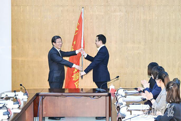 王东峰向青年讲师团团长柴勇授团旗