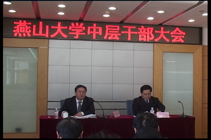 【新闻中心讯】2月20日下午,全校中层干部大会在世纪楼第一会议室召开,党委书记孟卫东主持会议,校长刘宏民就燕山大学2009年工作要点发表讲话。副校长杨育林、孔祥东、刘彬,校纪委书记潘洪江,副校长邢广忠、张福成、孔令富及各单位中层干部参加了会议。