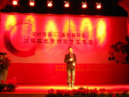 【新闻中心讯】12月22日, 河北省第四届外籍师生汉语技能暨中华才艺大赛在石家庄圆满结束。颁奖晚会在河北电视台隆重举行。 本次大赛由国家汉语国际推广领导小组办公室(国家汉办)、河北省教育厅主办、河北师范大学承办。因其规格高、影响大,受到各院校的高度重视,全省共有来自二十三个国家的近百名外籍师生参加了本次大赛,竞争异常激烈。 经过激烈的角逐,由我校俄罗斯学生安东、马来西亚学生黄尤君倾情演绎的经典话剧——《雷雨》(节选),荣获语言表演类二等奖。留学生扮演的周朴园和鲁侍萍,带给评委和观众耳目一新的感觉;荣获歌曲类二等奖的斯洛文尼亚选手尼娜头戴一顶牛仔帽,在舞台上载歌载舞,一曲爵士风格的《南屏晚钟》把东西文化很好地融合在一起,动听的歌声、大气的台风赢得了大家的一致好评;蒙古学生新波声情并茂地朗诵了拜伦的名篇——《雅典的少女》,该节目荣获朗诵类三等奖;日本学生高桥真实以其字正腔圆、清新自然的演讲——《我在中国过节》,喜获演讲类三等奖;韩国学生辛智慧演唱的“后来”,李经实的演讲——《泰山游记》、小合唱“我和你”,也赢得了台下阵阵掌声。我校也荣获本次大赛的“优秀组织奖”。