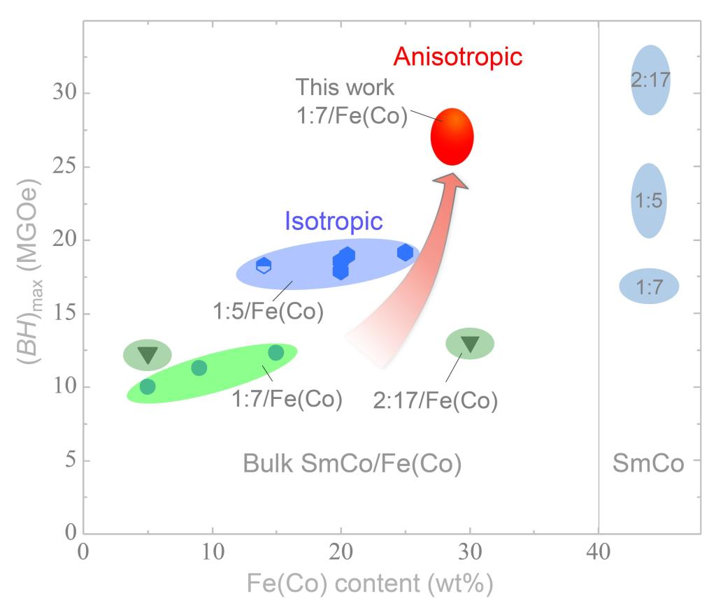 在国家自然科学基金的持续资助下,张湘义教授的研究团队提出了一种新颖的变形策略,制备出各向异性块体SmCo/FeCo纳米复合永磁材料,从而巧妙地解决了这个困扰世界各国研究人员二十多年的“工程噩梦”。该材料的磁能积(28 MGOe)为当前报道的含高软相分数块体纳米复合磁体的最高值,并超过了相应的纯稀土永磁材料(磁能积提高了58%)。另外,所制备的纳米复合材料的磁能积可以与当前商业SmCo5和Sm2Co17磁体相媲美,但是,少用稀土钐(Sm)20−39 %(重量百分数)。这优异的性能源于他们实现了对软、硬磁晶粒多个结构参数的同时控制。研究小组先采用机械合金化技术将软磁晶粒均匀分布在Sm−Co非晶基体上来控制软相的尺寸、含量和分布;然后,采用高压热梯度压缩变形,利用晶体的应变能各向异性,使硬磁晶粒在非晶基体中垂直取向生长,以获得沿易磁化轴对中的柱状硬磁纳米晶体,从而实现了对软磁和硬磁晶粒结构的同时控制。