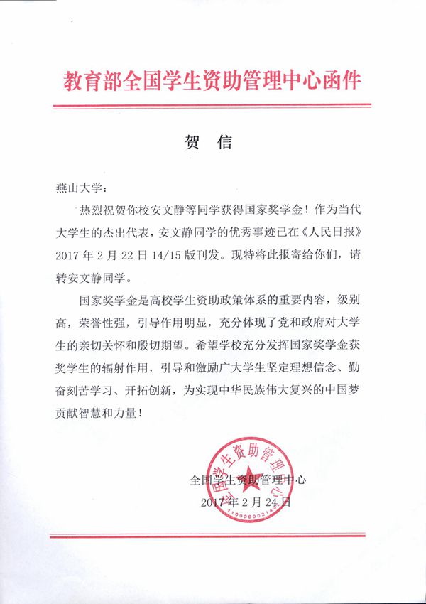 【新闻中心讯】近日,教育部全国学生资助管理中心发来贺信,祝贺我校安文静同学获得国家奖学金,并同时将刊发了安文静优秀事迹的《人民日报》转寄给安文静同学。此次人民日报刊登了全国108名获奖大学生代表名录,河北省2人。