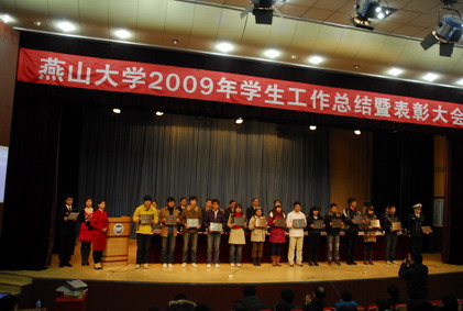 大会对在2008—2009学年中表现出色、成绩突出的先进集体和先进个人进行了表彰,授予机械学院机制07—1班、国防生大队一中队等27个班集体“优秀文明班级”称号,授予杨林霖、王江帆等13名学生“三好学生标兵”称号,授予尹增宝等35名辅导员“优秀辅导员”称号;对机械工程学院团委等5个优秀基层团组织进行了表彰;授予燕山大学国旗护卫队、全国大学生数学建模竞赛参赛队等7个团队和个人“特殊事迹奖”。(编辑 董世非)