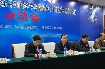 【新闻中心讯】2009年12月9日,由我校为第一承担单位、我校刘日平教授任首席科学家的国家重点基础研究计划(简称973项目)“空间飞行器长寿命关键构件制备与服役中的基础问题”项目启动会在北戴河新华假日酒店会议厅召开,河北省政府和国家科技部领导出席会议并作指示,至此,由我校担任首席单位的河北省内高校首个973项目全面启动。