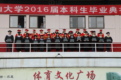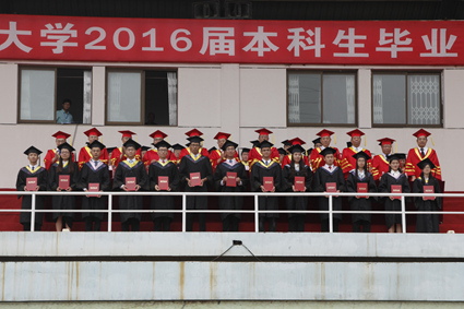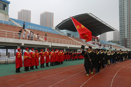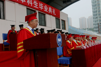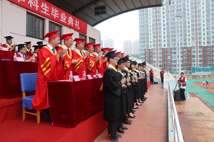 毕业典礼在雄壮的国歌声中拉开帷幕。各学院毕业生齐声高喊自己的口号,表达了同学们对未来的无限憧憬和努力开辟新天地的壮志豪情。刘宏民校长为来自各学院的26名毕业生代表授予学位,全体校领导为14名留学生毕业生授予学位。