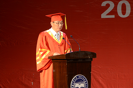 校长刘宏民在典礼上做了《坚守理想信念,创造一流人生》的讲话。刘宏民校长代表学校向圆满完成学业的113名博士生和2155名硕士生表示热烈的祝贺和美好的祝愿,向全体研究生导师以及为学位与研究生教育工作做出贡献的广大教职员工致以崇高的敬意和衷心的感谢。刘宏民校长对毕业研究生提出三点殷切期望:希望他们树立家国情怀,担负历史责任,为更多人的福祉去奋斗,创造精彩非凡的一流人生;善于思考质疑,坚守做人底线,拼搏进取的同时做中国社会的良心,创造“君子之风”的一流人生;终身学习研究,勇于开拓创新,始终站在科学技术、改革发展的时代前沿,创造壮怀激烈的一流人生。刘宏民校长对毕业生们深情表示,母校永远是他们的坚强后盾和温暖港湾,欢迎毕业生常回家看看。最后,刘宏民校长祝愿毕业生们一路顺风,鹏程万里,万事如意。