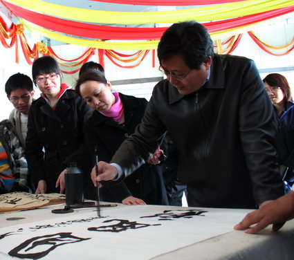 开幕式结束后,在与会人员的陪同下,孟卫东书记参观了书法协会、话剧团等部分学生社团展览。在同学们的盛情邀请下,孟书记现场挥毫为社团展示月活动题词:“社团风采”。