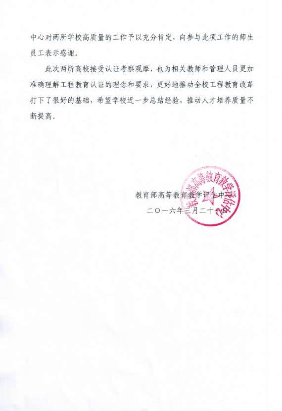 【新闻中心讯】3月21日,教育部高等教育教学评估中心致函我校,对我校材料成型及控制工程和电子信息工程两个专业接受《华盛顿协议》专家考察观摩工作给予充分肯定,并向参与此项工作的师生员工表示感谢。