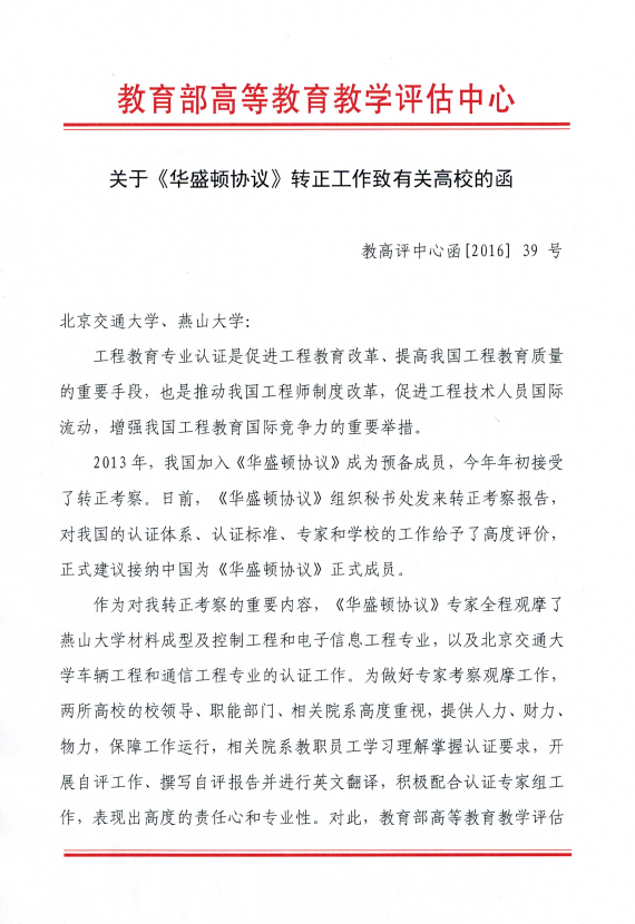 2013年,我国加入《华盛顿协议》成为预备成员,2016年年初接受了转正考察。燕山大学和北京交通大学代表国家成为《华盛顿协议》组织考察的观摩单位。作为转正考察的重要内容,1月5日至8日,《华盛顿协议》专家全程观摩了我校材料成型及控制工程和电子信息工程两个专业的认证工作。日前,《华盛顿协议》组织秘书处给我国相关部门发来转正考察报告,对我国的工程认证体系、认证标准、认证专家和学校的工作给予了高度评价,正式建议接纳中国为《华盛顿协议》正式成员。