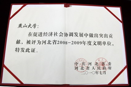 校党委副书记陈春利在讲话中表示,荣获“省级文明单位”称号是我校政治生活中的一件大喜事,我校在河北省委、省政府和省国防科工局的指导、支持和帮助下,我校第四次荣获这一荣誉,这既是对燕山大学过去工作的肯定,更是对燕山大学以后工作的鼓励和鞭策。我校一定会以此为契机,再接再厉,团结进取,扎实工作,努力开创我校精神文明建设和各项工作新局面。