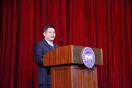 孟卫东书记在晚会上致辞,他从教学、科研、学科建设、师资建设、学生工作以及里仁学院等六个方面总结了我校2014年取得的成绩,着重肯定了我校取得“省部部”共建的突破、“12·7冰海救人”先进学生群体以及田永君教授团队在极硬材料合成研究领域的研究成果,并代表学校领导班子向全体师生及关心支持燕山大学发展的各界朋友送上新年的祝福。