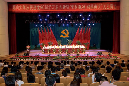 【新闻中心讯】6月23日下午2点30分,我校庆祝建党90周年表彰大会暨“党旗飘扬•和谐燕大”文艺演出在东校区大学生活动中心演播大厅举行。校领导孟卫东、刘宏民、陈春利、盛婉玉、杨育林、孔祥东、刘彬、邢广忠、孔令富、张景超、魏冰、杨晓峰出席表彰大会并观看了文艺演出。校党委副书记陈春利主持了表彰大会。