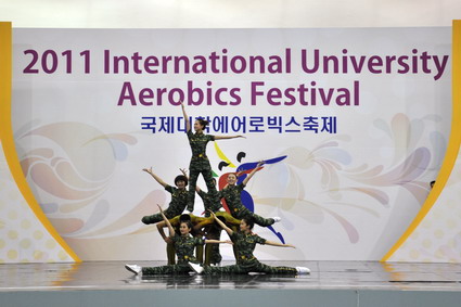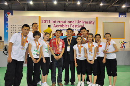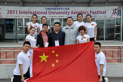 【新闻中心讯】记者从体育学院获悉,经教育部大学生体育协会批准,5月18日至21日,我校健美操队代表中国大学生赴韩国龙仁市檀国大学参加了中日韩国际健美操精英赛,并于5月24日凯旋。在大众类团体和个人的三个比赛项目中,我校健美操队喜获团体比赛项目一金一银,2人个人项目第一名,以及代表团团体金奖的骄人成绩。