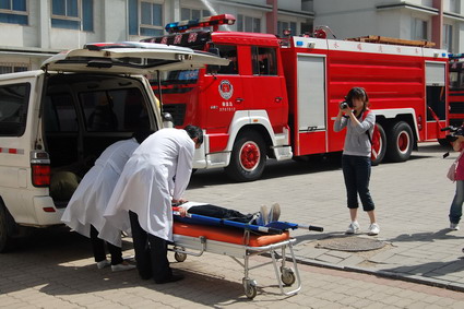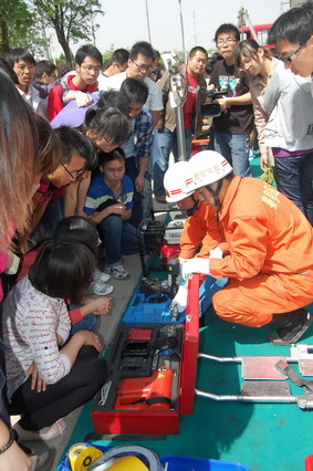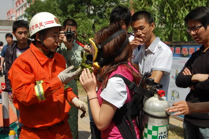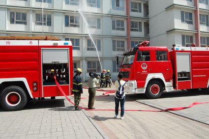 演练设置的情景为,因不明原因,西校区第九公寓发生火灾。火情发生后,学校立即启动《燕山大学消防突发事件应急预案》。伴随着短促报警铃声的响起,消防实战演练正式拉开序幕。首先由公寓管理员和学生形成第一灭火战斗力量扑灭初期火灾,同时2200余名学生迅速撤离公寓。随后保卫处工作人员赶赴火灾现场,形成第二灭火战斗力量,进一步实施灭火;与此同时,秦皇岛消防支队在接到火警后赶到学校公寓火灾现场,分别实施了现场灭火、地面救援和空中救援三种模拟演练。整个消防实战演练过程突出了知识性、参与性和实战性等特点,顺利完成了实战演练任务。演练结束后,消防官兵还给同学们现场讲解了消防器械的原理和使用方法。
