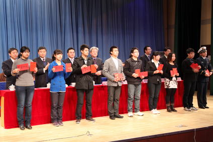 与会校领导为优秀学生代表颁发证书和奖金 (学工处提供)