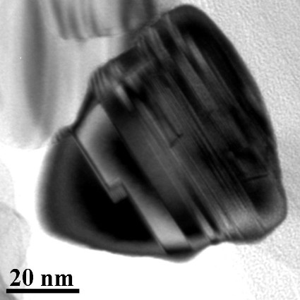 图为合成样品中一个纳米晶粒的透射电镜明场像,晶粒内部形成了薄片状的纳米孪晶