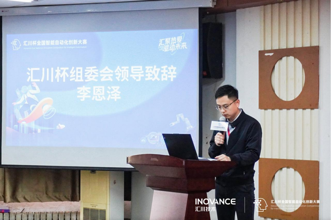 汇川技术生态战略发展部总裁李恩泽代表大赛组委会致辞。他表示,汇川技术作为国内自动化行业的领军企业,一直致力于技术创新和产业链整合,以提升竞争力,推动中国制造的高质量发展。此次,汇川技术希望通过“汇川杯”大赛,为热爱自动化技术的学子们搭建一个聚合的平台,促进交流学习与探索创新。同时,期望通过大赛推动高校工程教育改革与产业创新实践的深度融合,从而打造出智能制造人才培养的沃土,最终为社会培育和输送更多掌握国有技术的卓越工程师和创新人才。
