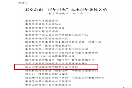 【新闻中心讯】近日,共青团秦皇岛市委公布了秦皇岛市“百年百杰”杰出青年(集体)名单,燕山大学机械工程学院学生工作团队名列其中