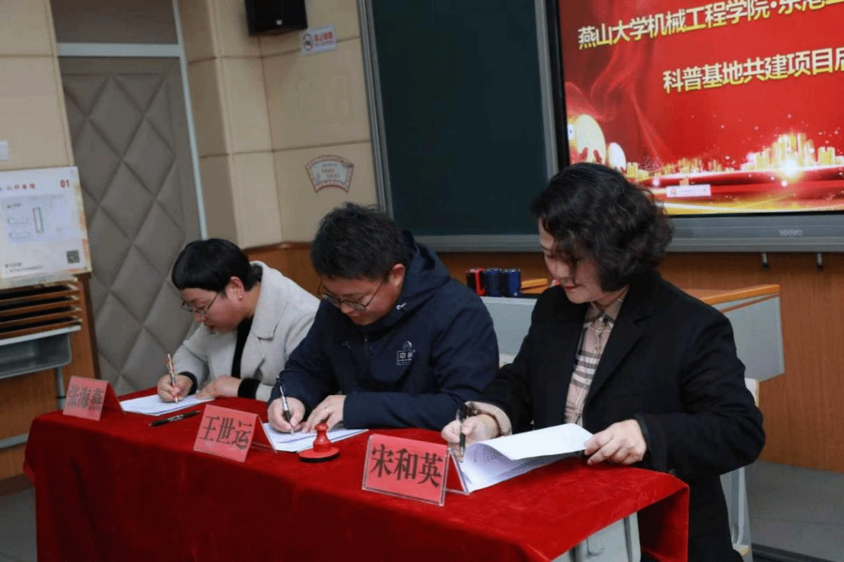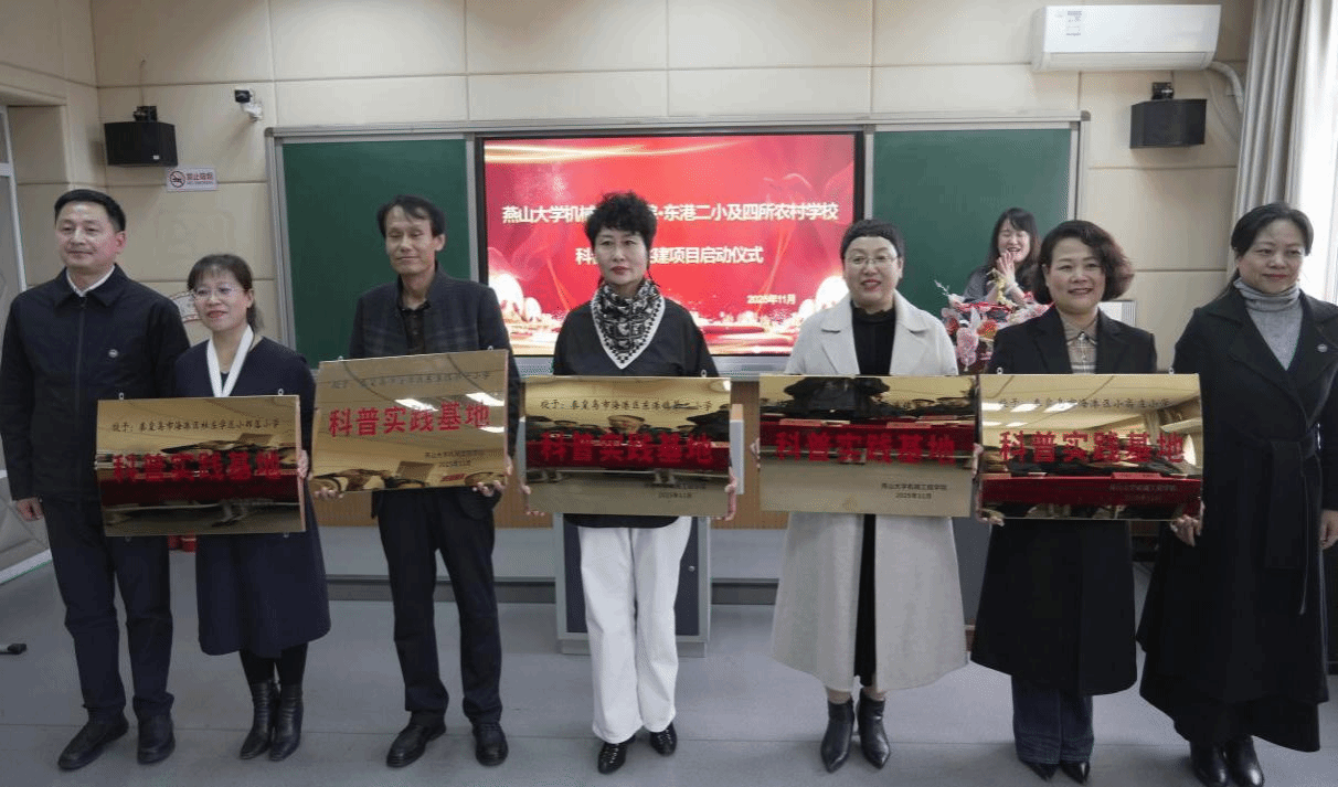 五所农村小学校长依次为科技辅导员颁发聘书;随后,燕山大学机械工程学院与五所农村小学签署《共建科普实践基地合作协议》,并为他们授牌。