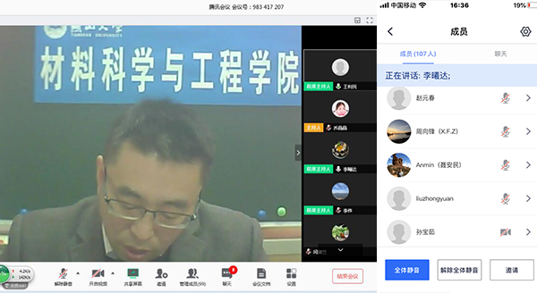 【新闻中心讯】新冠肺炎疫情始料未及,为有效确保疫情防控时期学院各项工作的快速推进,2月27日16:00,材料科学与工程学院召开2020年春季学期全院网络视频会议,学院国内外107位老师在线参会。会议由学院党委书记李曦达主持。