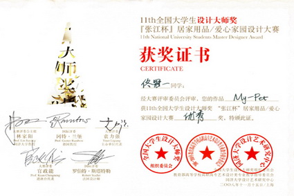 【新闻中心讯】在08年11月结束的2008“张江杯”全国大学生设计大师奖中,里仁学院06级学生佟冠一的作品《My-Pet》在参赛的6790件中获得优秀奖。