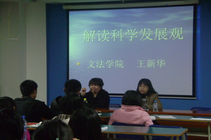 【新闻中心讯】4月2日下午外国语学院的401教室里座无虚席。一场题为《解读科学发展观》的报告正在这里举行。为深入学习党的科学发展观,使党员干部党员干部充分发挥表率作用,学深学透学精,做到学有所获,学有所用,外国语学院党委特别邀请文法学院的王新华教授为全院的师生党员、入党积极分子作了一场别开生面的报告。