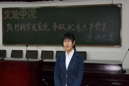 本次比赛是文法学院积极响应校党委号召“学习实践科学发展观”而开展的系列活动之一。旨在深化同学们对科学发展观的认识,树立党员的模范带头作用,鼓励同学们从自身做起践行科学发展观。(编辑 朱可嘉)