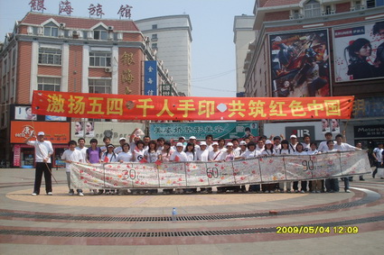 【新闻中心讯】为继承和发扬五四精神,使新历史条件下的五四精神和爱国精神更加深入人心,发扬广大团员青年的先锋作用,环化学院团委举办了校2009年五四文化艺术节之“激扬五四 千人手印 共筑红色中国”的纪念活动。 5月4日,该院于秦皇岛市中心太阳城广场举办千人手印活动,穿行于广场的市民,不论男女老少均给予了活动大力支持,他们将自己对祖国的祝福话语写在条幅上,并按上自己的手印。《燕赵都市报》5月5日头版对该项活动进行了报道,极大地扩大了此次活动的影响力。