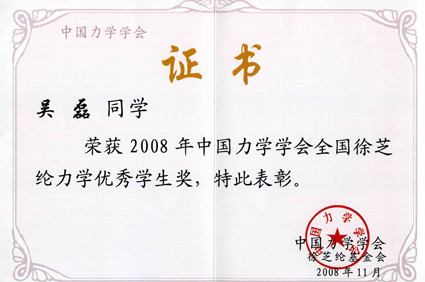 近日,在中国力学学会组织的力学优秀学生评选活动中,我校建筑工程与力学学院06级工程力学专业吴磊同学在全国23个省市推荐的千余名参评学生中脱颖而出,喜获“2008年中国力学学会全国徐芝纶力学优秀学生奖”。据悉,本此评选活动全国共评出110名优秀学生,其中河北省有6位同学获奖。