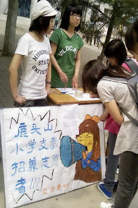 文法学院青年志愿者协会于2009年4月末了解到该小学的情况后,经过一个月的准备工作,面向全校招募志愿者前往鹿头山小学进行支教。5月21日、22日中午12:00~13:00,文法学院青年志愿者协会的志愿者们在东区二食堂、三食堂门口设点招募了一百二十多名有意向支教的大学生。5月23日下午及晚上,文法学院青年志愿者协会对这一百多名大学生进行了初试,并选拔出三十四名进入复试。5月24日晚七点,鹿头山小学李业丰校长、王玉丽主任和主管计算机的胡老师来到人文馆对通过初试的三十四名志愿者进行了面试。面试以试讲为主,最后共选拔出文法学院、经济管理学院、机械学院、外国语学院、信息学院和车辆学院的十五名志愿者。